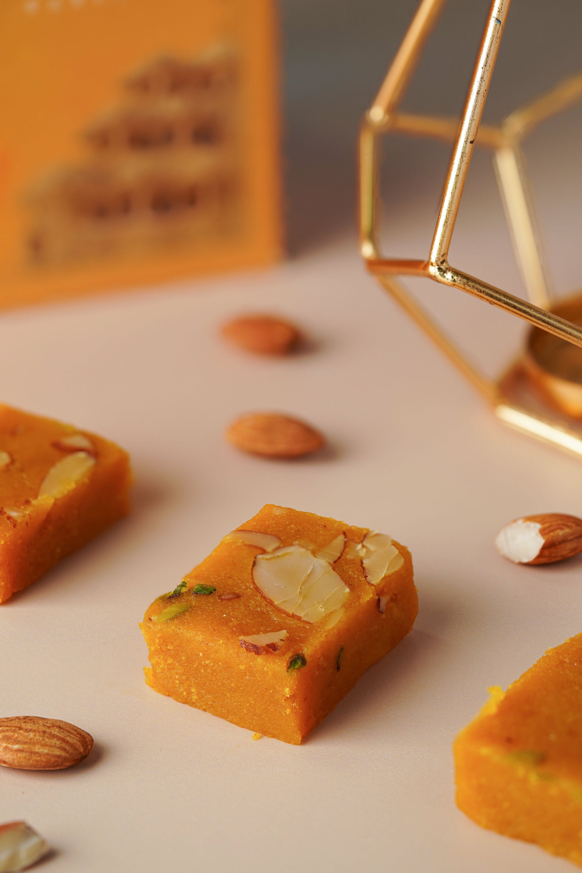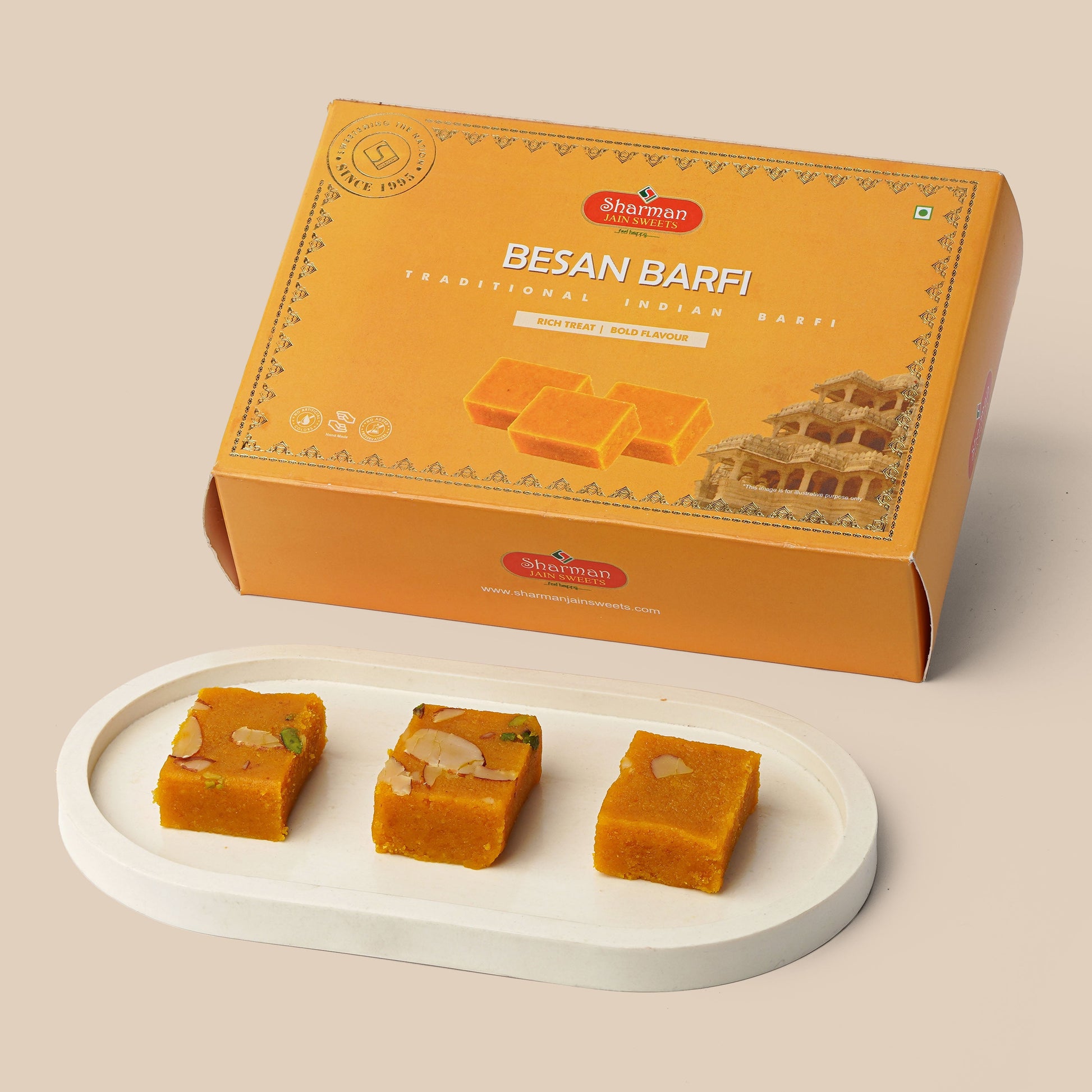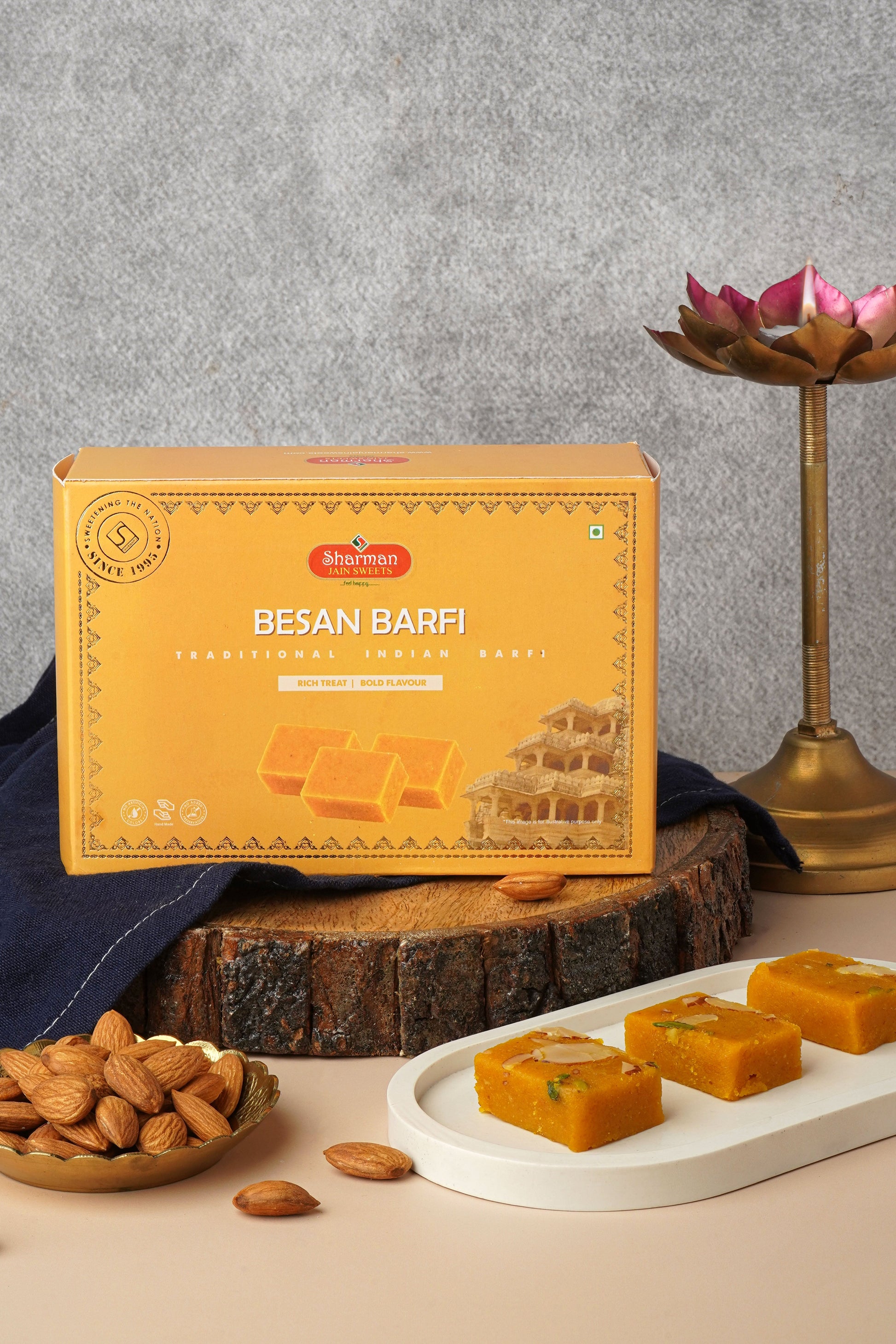 Indulge in the classic richness of our Besan Barfi! Made with a heavenly combination of gram flour (besan), ghee (clarified butter), and khoya (reduced milk solids), this decadent dessert is a true celebration of traditional Indian flavors. The besan is slow-cooked in ghee until golden, then bound with rich khoya and sweetened with perfectly balanced sugar syrup. Each bite is a delightful textural experience, offering a soft, melt-in-your-mouth base with a subtle crunch from the roasted gram flour. Enjoy a taste of timeless Indian indulgence with our Besan Barfi!
