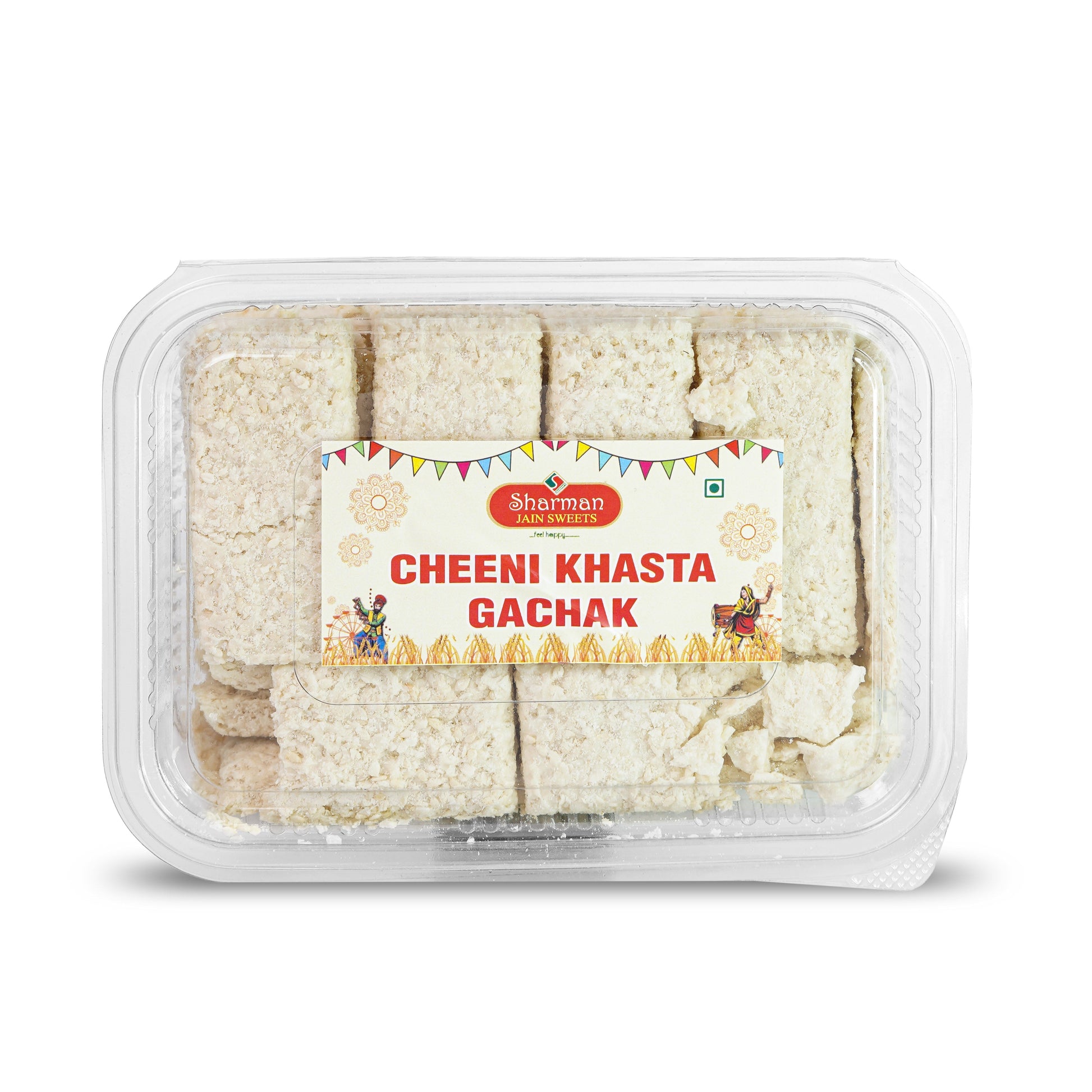 Cheeni Khasta Gachak is a crispy, sweet Indian snack made with jaggery (cheeni) and roasted sesame seeds. The mixture is bound together with sugar syrup and pressed into a firm, crunchy texture. Often enjoyed during festivals, it offers a perfect balance of sweetness and crunch, packed with energy.