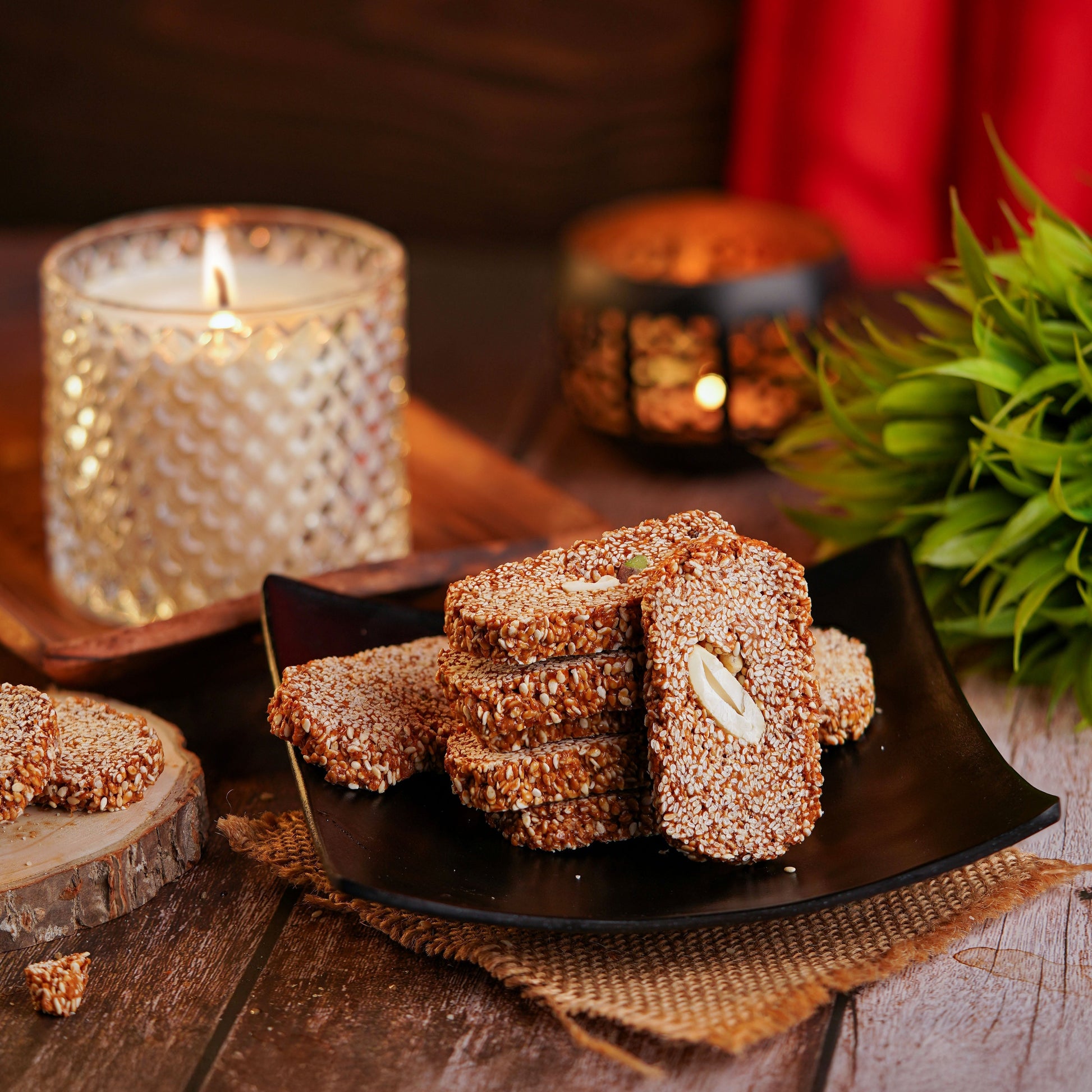 Chocolate Shalimar Gachak is a fusion sweet combining the traditional Gachak with rich chocolate. Made from roasted sesame seeds, jaggery, and a generous layer of chocolate, it offers a crunchy texture with a creamy, chocolatey twist. This indulgent treat is a perfect blend of tradition and modern flavors.