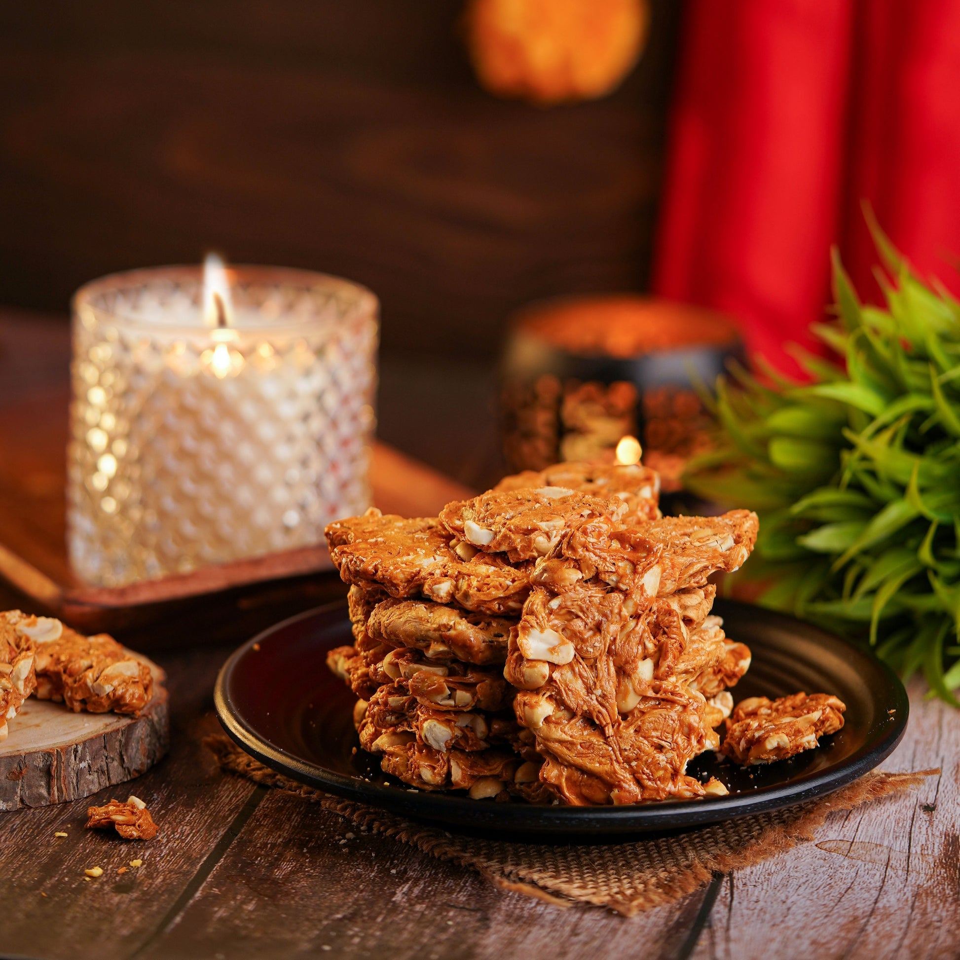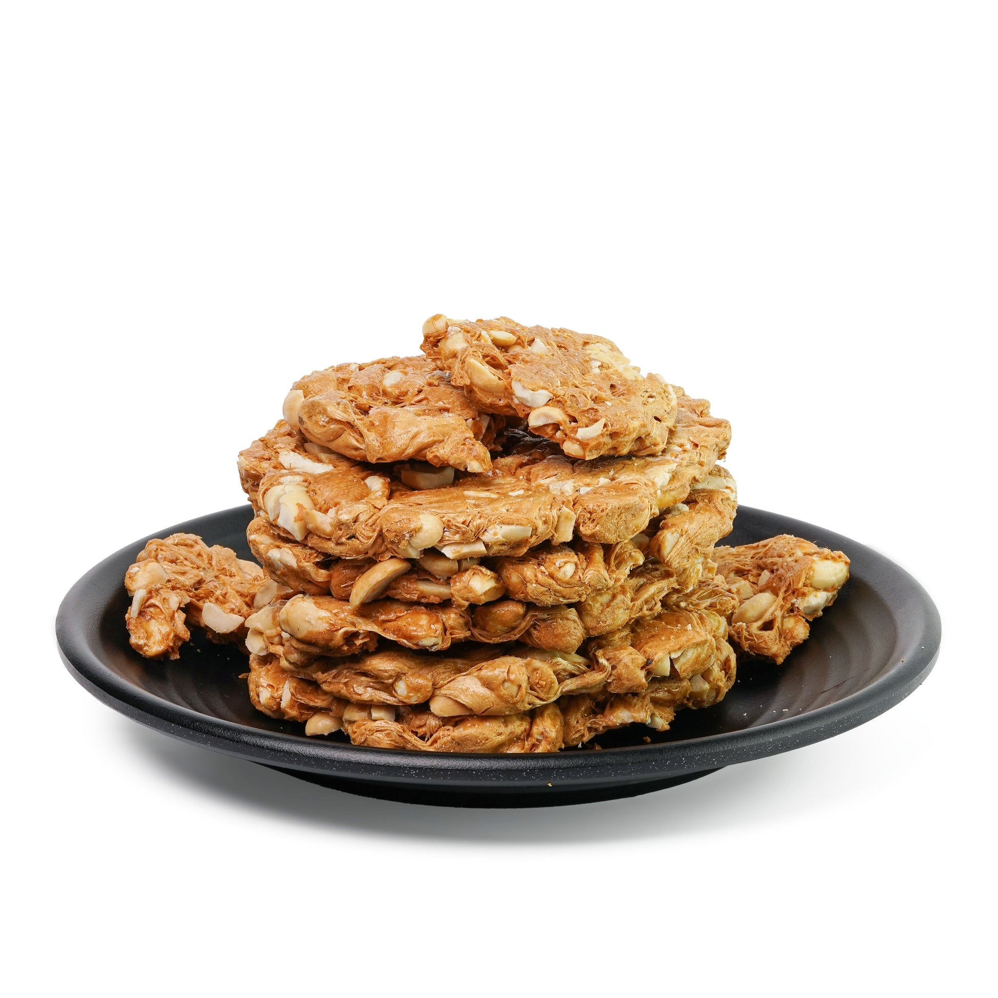 Mongfali Gachak is a crunchy Indian sweet made from roasted peanuts (mongfali) and jaggery. The peanuts are coated with a sticky jaggery syrup, then set into a firm, bite-sized bar. This treat offers a delightful combination of sweetness and crunch, making it a popular snack during winter and festivals.